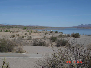 And this is our current spot at Caballo Lake State park in New Mexico. For those who are following the map, we headed east to Las Cruces and then we are headed north on Route 25 towards Truth or Consequences and Albuquerque. Caballo is the second largest lake in New Mexico. With the drought, the lake is down at least 15 feet. Route 25 follows the Rio Grande River north. The river is basically dry right now. The large lake at Elephant Butte--our next stop --releases water for the farmers in the Spring. Usually in March, but not until June this year. Farmers are hurting.